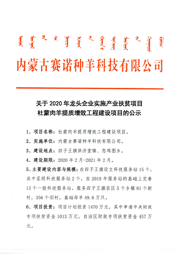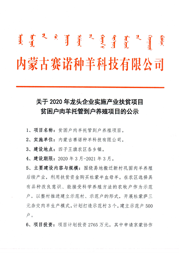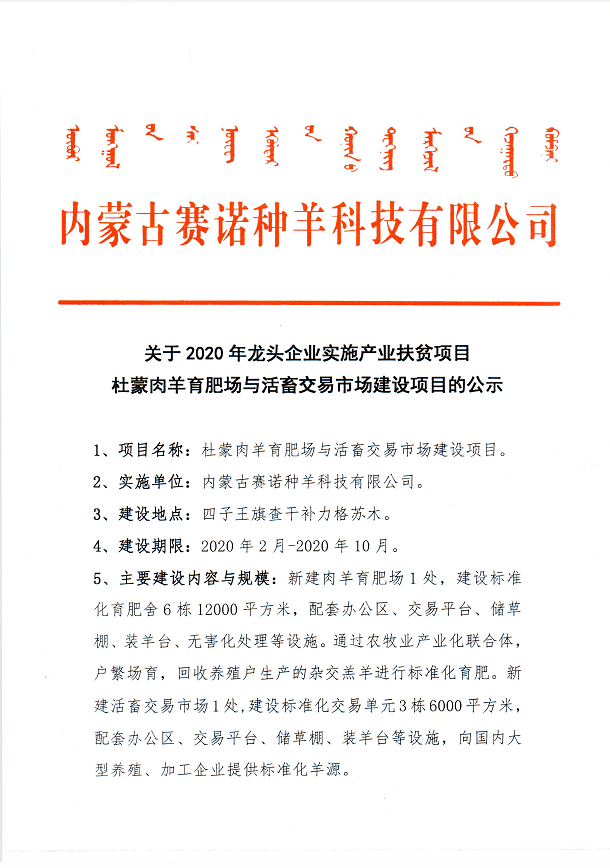 關(guān)于內(nèi)蒙古賽諾種羊科技有限公司承擔(dān)實(shí)施2020年龍頭企業(yè)實(shí)施產(chǎn)業(yè)扶貧項(xiàng)目的公示