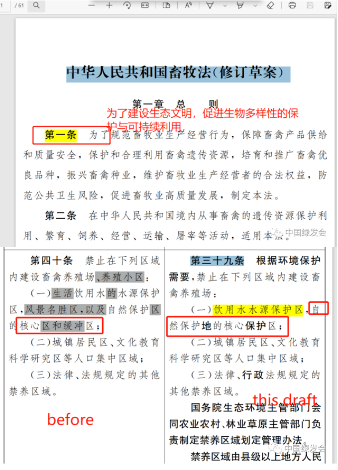 近日,第十三屆全國人大常委會第三十一次會議對《中華人民共和國畜牧法(修訂草案)》(下文簡稱《修訂草案》)進行了審議,目前正在公開征求意見中。中國生物多樣性保護與綠色發(fā)展基金會國際部的意見和建議如下:1、在總則第一條中,建議納入“生態(tài)文明”,以落實中央關(guān)于堅持和完善生態(tài)文明法治體系的要求;同時,由于《修訂草案》中目前尚無任何關(guān)于“生物多樣性”的表述,而禽畜品種的遺傳資源保護和可持續(xù)利用,也是糧農(nóng)生物多樣性的重要內(nèi)容。為了落實習(xí)總書記在10月12日召開的聯(lián)合國生物多樣性公約第十五屆締約方大會上的重要報告,建議加入“生物多樣性”。因此,【建議】將總則第一條表述為:第一條 為了建設(shè)生態(tài)文明,促進生物多樣性的保護與可持續(xù)利用,為了規(guī)范畜牧業(yè)生產(chǎn)經(jīng)營行為,保障畜禽產(chǎn)品供給和質(zhì)量安全,保護和合理利用畜禽遺傳資源,培育和推廣畜禽優(yōu)良品種,振興畜禽種業(yè),維護畜牧業(yè)生產(chǎn)經(jīng)營者的合法權(quán)益,防范公共衛(wèi)生風(fēng)險,促進畜牧業(yè)高質(zhì)量發(fā)展,制定本法。2、第二條中的“遺傳資源保護利用”容易引起歧義。建議改為“遺傳資源的保護和可持續(xù)利用”;3、在“申請取得生產(chǎn)家畜卵子、冷凍精液、胚胎等遺傳材料的生產(chǎn)經(jīng)營許可證”的一節(jié),建議增加“應(yīng)符合《生物安全法》的相關(guān)規(guī)定;”4、在《修訂草案》中,原來(第四十條)的“(一)生活飲用水的水源保護區(qū),風(fēng)景名勝區(qū),以及自然保護區(qū)的核心區(qū)和緩沖區(qū);”在《修訂草案》中被改為了“(一)飲用水水源保護區(qū),自然保護地的核心保護區(qū);”(見第三十九條)—— 也就是說,這意味著未來將放寬關(guān)于自然保護區(qū)的管理,將原來不能進行禽畜養(yǎng)殖的自然保護區(qū)的緩沖區(qū),變成可以養(yǎng)殖。我們認為這樣風(fēng)險比較大,尤其要考慮到病毒外溢的風(fēng)險。1998年在東南亞爆發(fā)的尼帕病毒就是一個警示。養(yǎng)殖區(qū)不宜距離自然保護區(qū)太近。【案例】1998年9月到1999年4月,僅僅半年期間,在東南亞的馬來西亞出現(xiàn)了260多例流行病學(xué)異常的腦炎病人,死亡100多人,病死率高達48%,從這種急性腦炎康復(fù)的病人多數(shù)有一定的神經(jīng)性后遺癥。人的感染來自于豬,剛開始人們不知道為什么,撲殺了100多萬頭感染的豬。后來研究人員才發(fā)現(xiàn)是由一種新的病毒感染所致,這種病毒被命名為尼帕病毒(Nipah Virus)。后來查明原因是,為了養(yǎng)牲口,大面積的熱帶雨林被砍伐,無家可歸的一些果蝠落腳在養(yǎng)豬場,從而把病毒傳染給農(nóng)場里的豬,繼而傳染給人類。【建議】因此,我們不建議放寬允許自然保護區(qū)的緩沖區(qū)用于禽畜養(yǎng)殖。另外,這樣也可能造成基因污染——養(yǎng)殖的物種與野生動物的基因交叉污染。5、【第四十八條】第四十八條 “國家鼓勵發(fā)展養(yǎng)蜂業(yè),維護養(yǎng)蜂生產(chǎn)者的合法權(quán)益。”建議增加一條:“在涉及到外來蜂種與傳統(tǒng)本土蜂種的時候,政策要向傳統(tǒng)本土蜂種傾斜。”上圖:正在征求意見的《中華人民共和國畜牧法(修訂草案)》中,放寬了原來對于自然保護區(qū)的要求,將原來的“緩沖區(qū)”刪除了。如果允許在自然保護區(qū)的緩沖區(qū)養(yǎng)殖禽畜,或?qū)⒖赡茉黾油ㄟ^家畜家禽傳播人畜共染病的幾率。為了減少病毒外溢(spillover),我們認為不應(yīng)該刪除這一條。2、第二條中的“遺傳資源保護利用”容易引起歧義。建議改為“遺傳資源的保護和可持續(xù)利用”;