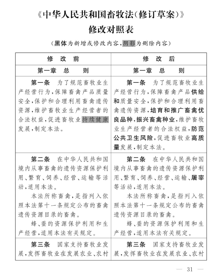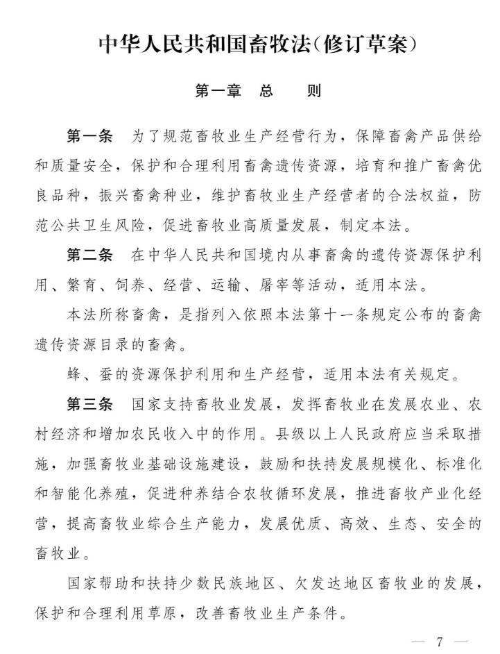第十三屆全國人大常委會(huì)第三十一次會(huì)議對(duì)《中華人民共和國畜牧法(修訂草案)》進(jìn)行了審議?,F(xiàn)將《中華人民共和國畜牧法(修訂草案)》予以公布,社會(huì)公眾可以直接登錄中國人大網(wǎng)(www.npc.gov.cn)或國家法律法規(guī)數(shù)據(jù)庫(flk.npc.gov.cn)提出意見,也可以將意見寄送全國人大常委會(huì)法制工作委員會(huì)(北京市西城區(qū)前門西大街1號(hào),郵編:100805。信封上請(qǐng)注明畜牧法修訂草案征求意見)。征求意見截止日期:2021年11月21日。