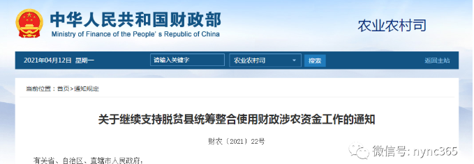 為貫徹落實《中共中央 國務(wù)院關(guān)于實現(xiàn)鞏固拓展脫貧攻堅成果同鄉(xiāng)村振興有效銜接的意見》精神,經(jīng)國務(wù)院同意,現(xiàn)就脫貧縣(指原832個連片特困地區(qū)縣和國家扶貧開發(fā)工作重點縣)延續(xù)執(zhí)行《國務(wù)院辦公廳關(guān)于支持貧困縣開展統(tǒng)籌整合使用財政涉農(nóng)資金試點的意見》(國辦發(fā)〔2016〕22號)有關(guān)事項通知如下:2021-2023年,在脫貧縣延續(xù)整合試點政策。2024-2025年,整合試點政策實施范圍調(diào)整至中央確定的國家鄉(xiāng)村振興重點幫扶縣,確保平穩(wěn)過渡。各?。▍^(qū)、市)自行確定的其他試點縣,可利用地方各級財政資金繼續(xù)自主開展探索。納入整合試點范圍的資金(以下統(tǒng)稱整合資金)包括各級財政安排用于農(nóng)業(yè)生產(chǎn)發(fā)展和農(nóng)村基礎(chǔ)設(shè)施建設(shè)等方面的資金,原則上與國辦發(fā)〔2016〕22號文件規(guī)定的范圍保持一致(具體資金名稱及支出方向以2020年為準(zhǔn),見附件)。地方各級財政部門要結(jié)合本地實際,明確本級整合資金范圍。教育、醫(yī)療、衛(wèi)生等社會事業(yè)方面資金,也要結(jié)合鞏固拓展脫貧攻堅成果和鄉(xiāng)村振興任務(wù),突出重點,集中投入,形成合力。脫貧縣根據(jù)鞏固拓展脫貧攻堅成果和鄉(xiāng)村振興的需要,可以按規(guī)定將整合資金用于農(nóng)業(yè)生產(chǎn)、畜牧生產(chǎn)、水利發(fā)展、林業(yè)改革發(fā)展、農(nóng)田建設(shè)、農(nóng)村綜合改革、林業(yè)草原生態(tài)保護(hù)恢復(fù)、農(nóng)村環(huán)境整治、農(nóng)村道路建設(shè)、農(nóng)村危房改造、農(nóng)業(yè)資源及生態(tài)保護(hù)、鄉(xiāng)村旅游等農(nóng)業(yè)生產(chǎn)發(fā)展和農(nóng)村基礎(chǔ)設(shè)施項目,在整合資金范圍內(nèi)打通,統(tǒng)籌安排使用。脫貧縣要將支持產(chǎn)業(yè)發(fā)展擺在優(yōu)先位置,發(fā)展壯大脫貧地區(qū)優(yōu)勢特色產(chǎn)業(yè)(含必要的產(chǎn)業(yè)配套基礎(chǔ)設(shè)施),促進(jìn)產(chǎn)業(yè)提質(zhì)增效,帶動脫貧人口就業(yè)增收。脫貧縣要將整合資金優(yōu)先用于產(chǎn)業(yè)項目。中央和省、市級財政要在保持投入總體穩(wěn)定的基礎(chǔ)上,繼續(xù)按政策要求向符合條件的脫貧縣傾斜。原則上納入整合試點范圍各項中央財政涉農(nóng)資金用于832個脫貧縣的資金總體增幅不低于每項資金的平均增幅,或確保當(dāng)年安排脫貧縣的資金縣均投入規(guī)模不低于其他縣的縣均投入規(guī)模。中央預(yù)算內(nèi)投資在充分考慮規(guī)劃任務(wù)、地方需求等情況的基礎(chǔ)上統(tǒng)籌加大對脫貧縣支持力度。整合資金原則上仍按原渠道下達(dá)到縣。其中,納入直達(dá)資金范圍的資金,按照直達(dá)資金管理的有關(guān)要求下達(dá)。地方各級財政部門要會同相關(guān)部門,利用現(xiàn)有信息系統(tǒng),建立整合資金臺賬和做好統(tǒng)計分析工作,掌握資金下達(dá)進(jìn)度、支出進(jìn)度和用途、績效等情況,定期匯總報告。脫貧縣根據(jù)“三農(nóng)”工作方針政策、本地鞏固拓展脫貧攻堅成果同鄉(xiāng)村振興有效銜接規(guī)劃和相關(guān)行業(yè)規(guī)劃等,編制年度整合資金實施方案,確定好重點項目和建設(shè)任務(wù),兼顧脫貧村和其他村、脫貧戶和其他戶,因地制宜統(tǒng)籌安排和管好用好整合資金。有關(guān)部門和地方不得干擾脫貧縣按規(guī)定使用整合資金。脫貧縣要健全完善鞏固拓展脫貧攻堅成果和鄉(xiāng)村振興項目庫,整合資金支持的項目原則上從項目庫中選擇,做好項目儲備,科學(xué)設(shè)定績效目標(biāo),嚴(yán)格項目論證入庫。鼓勵整合資金優(yōu)先安排用于既有利于鞏固拓展脫貧攻堅成果、又有利于完成行業(yè)發(fā)展任務(wù)的項目,凝聚支持合力。落實項目資金公開公示和績效管理要求,主動接受各方監(jiān)督。嚴(yán)肅財經(jīng)紀(jì)律,切實防范和化解風(fēng)險隱患,整合資金不得用于償還債務(wù)、墊資或回購、注資企業(yè)、設(shè)立基金、購買各類保險等。堅持“中央統(tǒng)籌、省負(fù)總責(zé)、市縣鄉(xiāng)抓落實”的工作機(jī)制。中央部門統(tǒng)籌指導(dǎo)并加強(qiáng)考核。省級對整合試點負(fù)總責(zé),根據(jù)本通知要求制定整合試點實施細(xì)則,強(qiáng)化對脫貧縣整合試點工作的全過程監(jiān)督指導(dǎo)。進(jìn)一步推動審批權(quán)限下放到脫貧縣,縣級承擔(dān)資金安全、規(guī)范、有效使用的主體責(zé)任,切實加強(qiáng)整合資金使用和項目管理。有關(guān)部門將對政策實施效果進(jìn)行系統(tǒng)總結(jié)和科學(xué)評估。